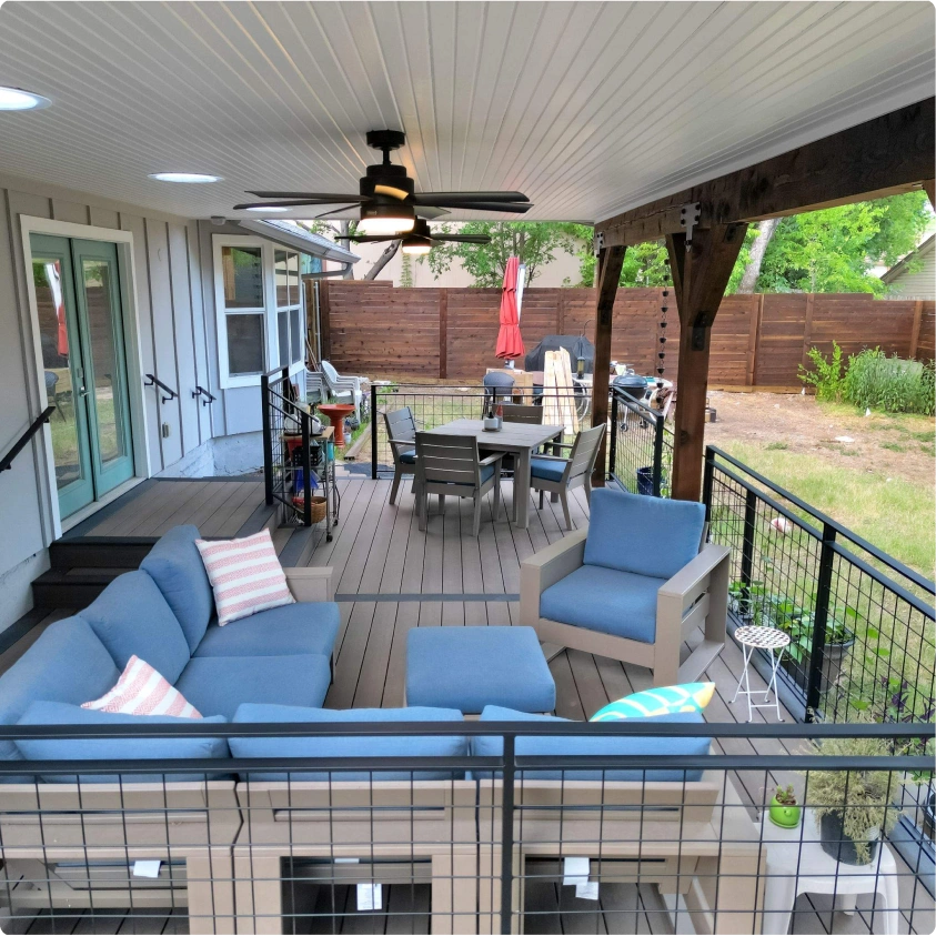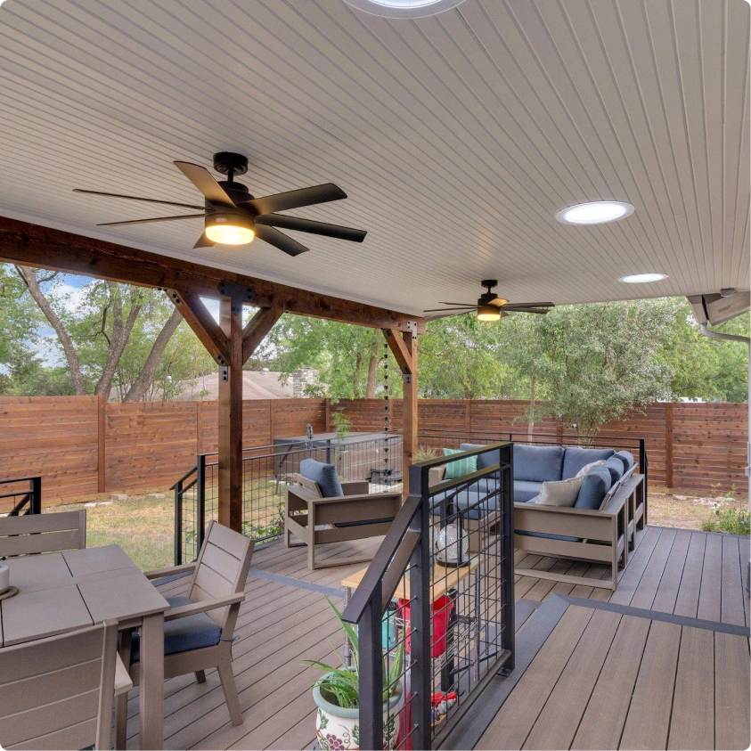 What began as an underused backyard corner is now the family’s favorite retreat. The covered deck created a bright, shaded space that remains comfortable year-round. Natural light filters through skylights during the day, while ceiling fans maintain airflow on warm evenings.